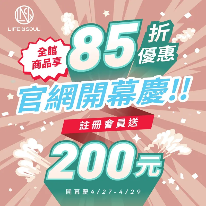 - 本活動僅限台灣地區使用,且限於 Life n Soul 官方網站(lifensoul.com)消費,不適用於其他電商平台。